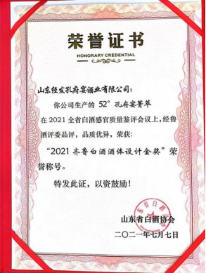 孔府宴酒獲“2021齊魯白酒酒體設(shè)計(jì)金獎(jiǎng)”榮譽(yù)稱號(hào)